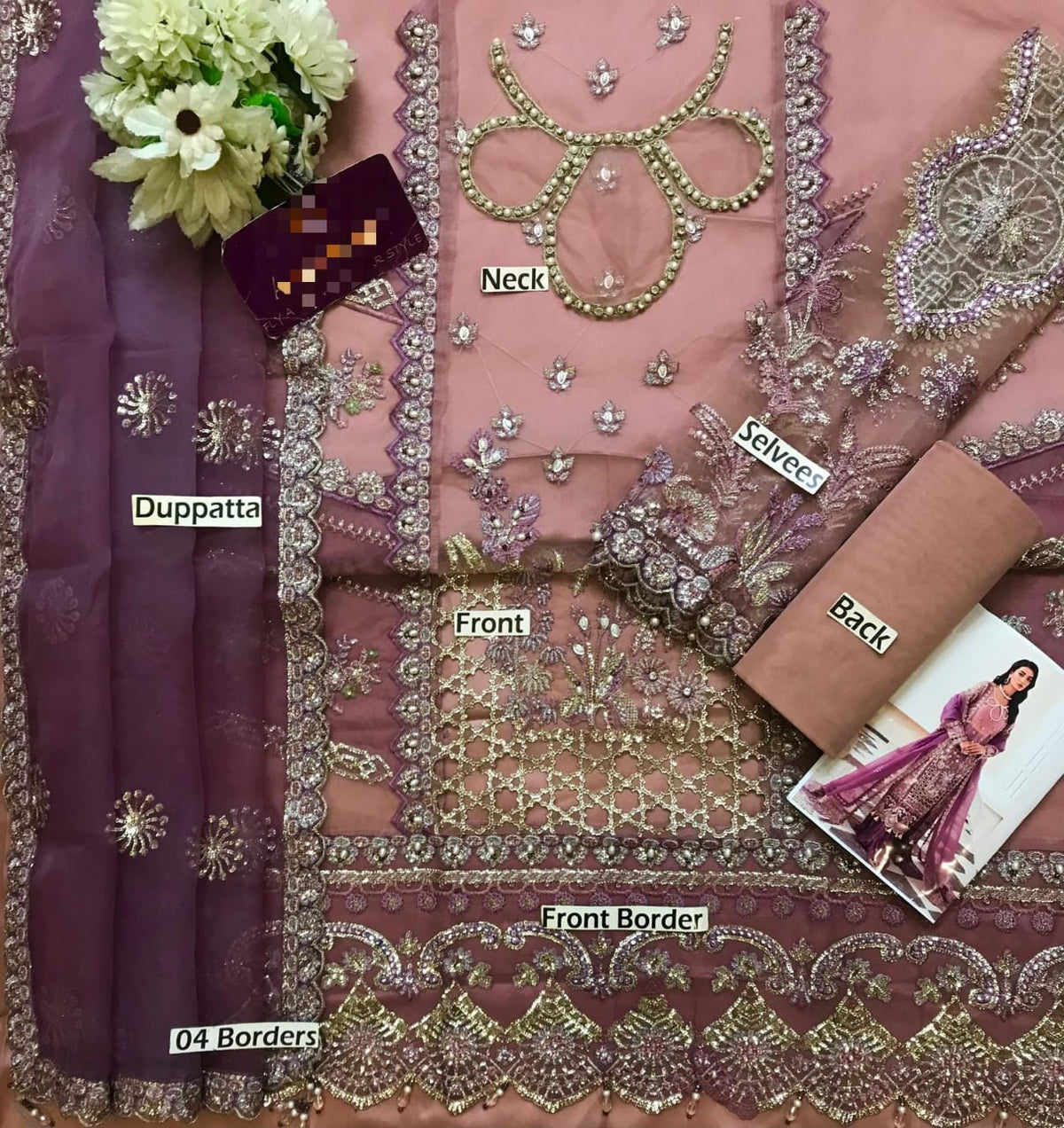 FRONT: ORGANZA WITH HEAVY EMBROIDERY, ADDA WORK, AND HANGING TASSELS WITH CUT WORK. NECK: HEAVY EMBROIDERED WITH ADDA WORK. BORDER: HEAVY EMBROIDERY WITH ADDA WORK AND HANGING TASSELS. BACK: ORGANZA WITH HEAVY EMBROIDERED SLEEVES AND ADDA WORK. SLEEVES CUFF: HEAVY EMBROIDERY WITH HANGING TASSELS. DUPATTA: FULL HEAVY EMBROIDERED ORGANZA WITH 4-SIDE CUT BORDER AND HANGING TASSELS. TROUSER: SHAMOZ SILK FABRIC.