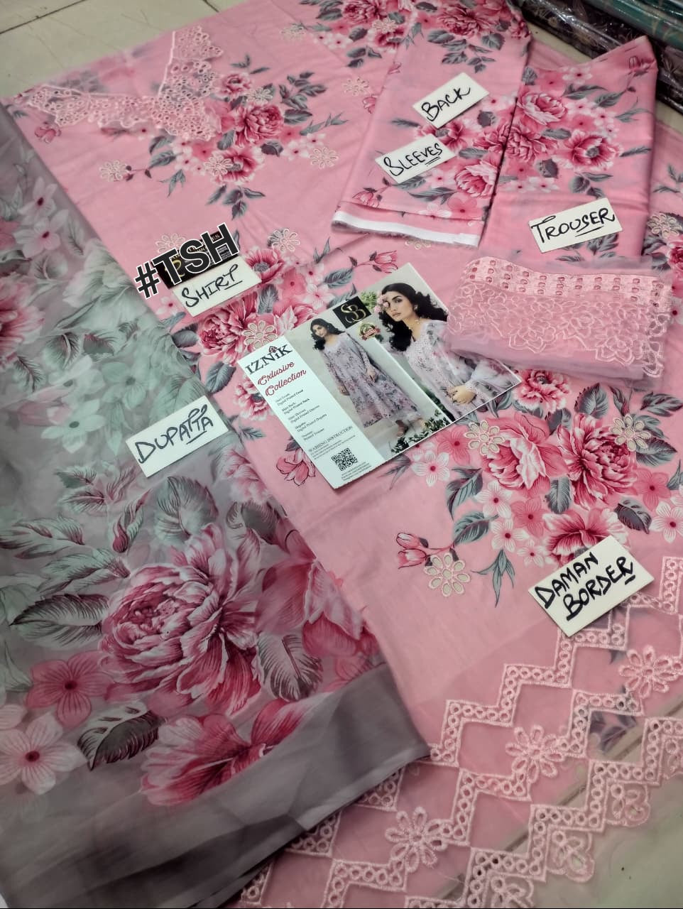 FRONT: DIGITAL PRINTED + CHICKENKARI LAWN WITH EMBROIDERED DAMAN BORDER AND NECK PATCH - BACK: DIGITAL PRINTED LAWN - SLEEVES: DIGITAL PRINTED LAWN - DUPATTA: PRINTED CHIFFON - TROUSER: DIGITAL PRINTED LAWN WITH EMBROIDERED TROUSER BUNCH