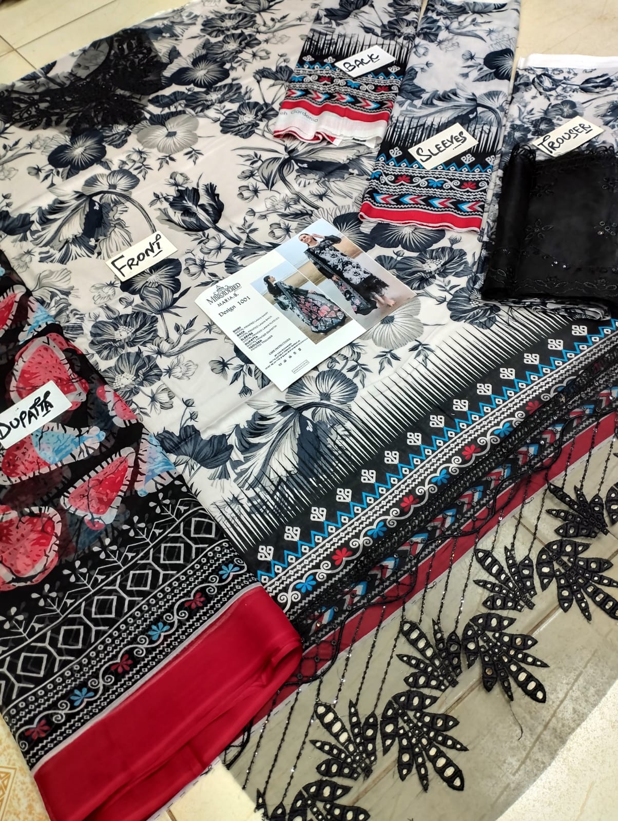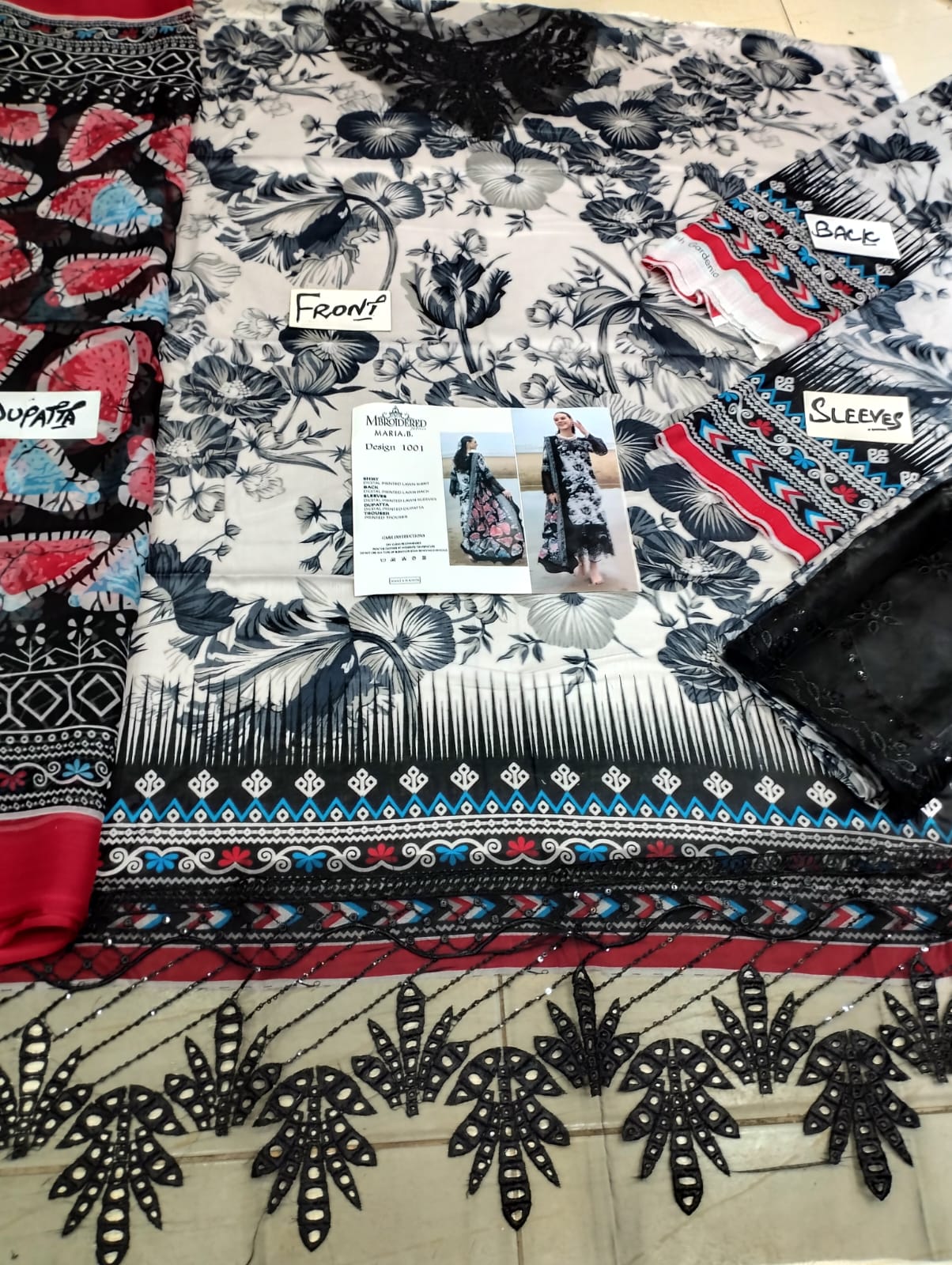 - DIGITAL PRINTED LAWN FRONT WITH EMBROIDERED NECK & DAMAN BORDER - DIGITAL PRINTED LAWN BACK & SLEEVES - PRINTED CHIFFON DUPATTA - PRINTED LAWN TROUSER WITH TROUSER PATCH